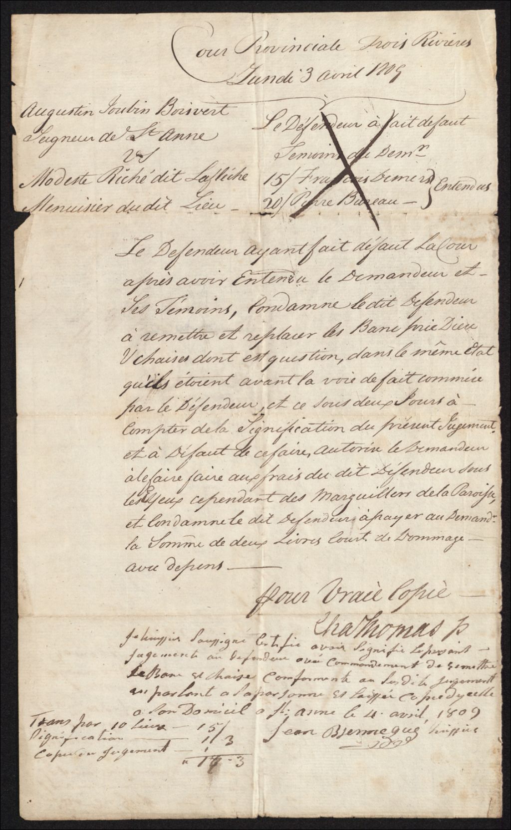 Jugement (destruction d’un prie-dieu), 1809-04-03, Archives nationales à Trois-Rivières, Collection seigneuries Sainte-Anne et Sainte-Marie, (04T,P134,S2,SS6,D11).