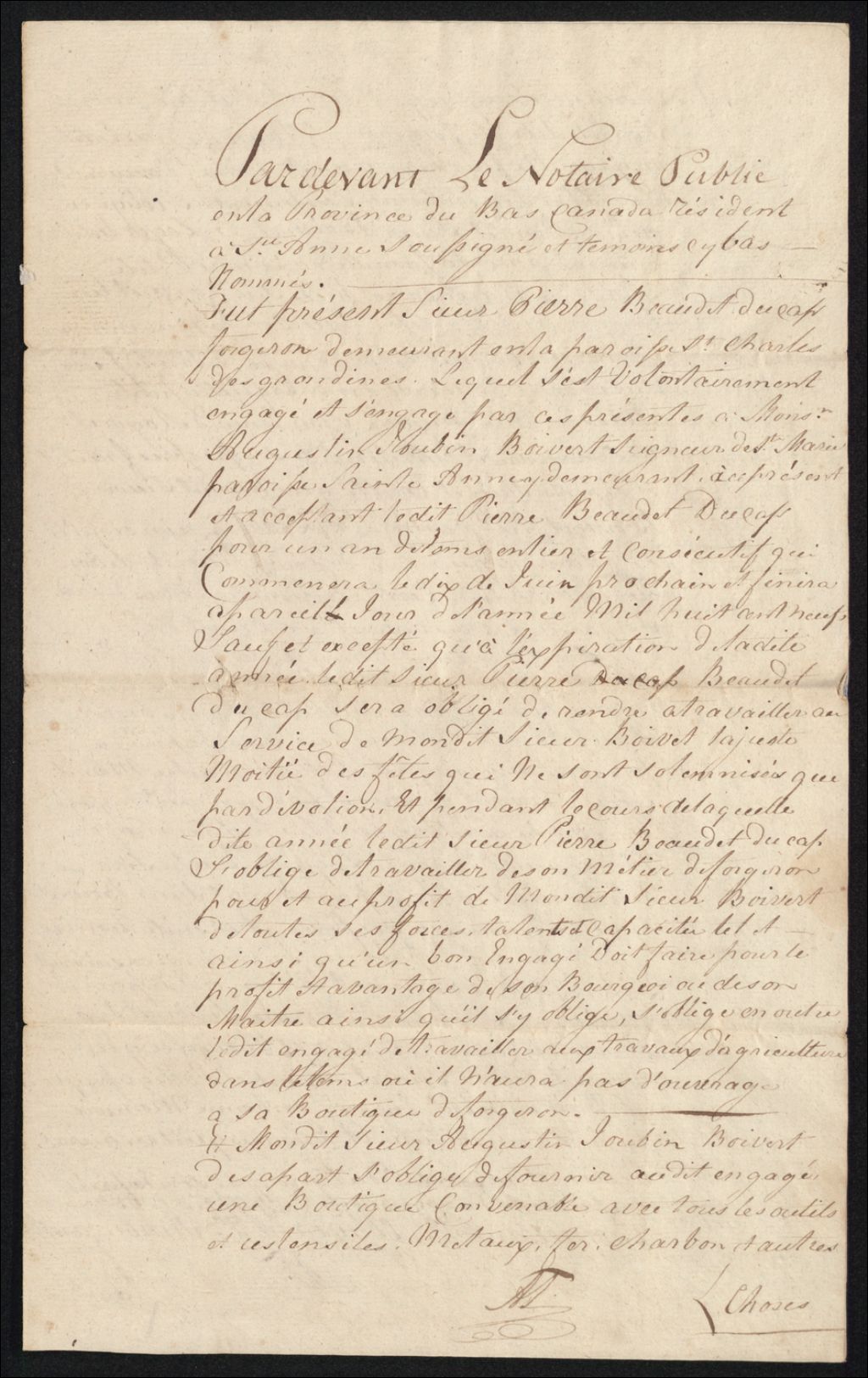 - Marché (contrat d¿embauche d¿un employé de ferme) entre Augustin Joubin-Boisvert et Pierre Beaudet par J. Augustin Trudel, notaire