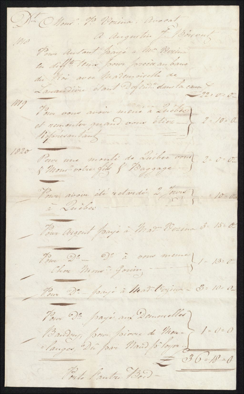 Compte (services juridiques) entre Augustin Joubin-Boisvert et A. Vézina, avocat