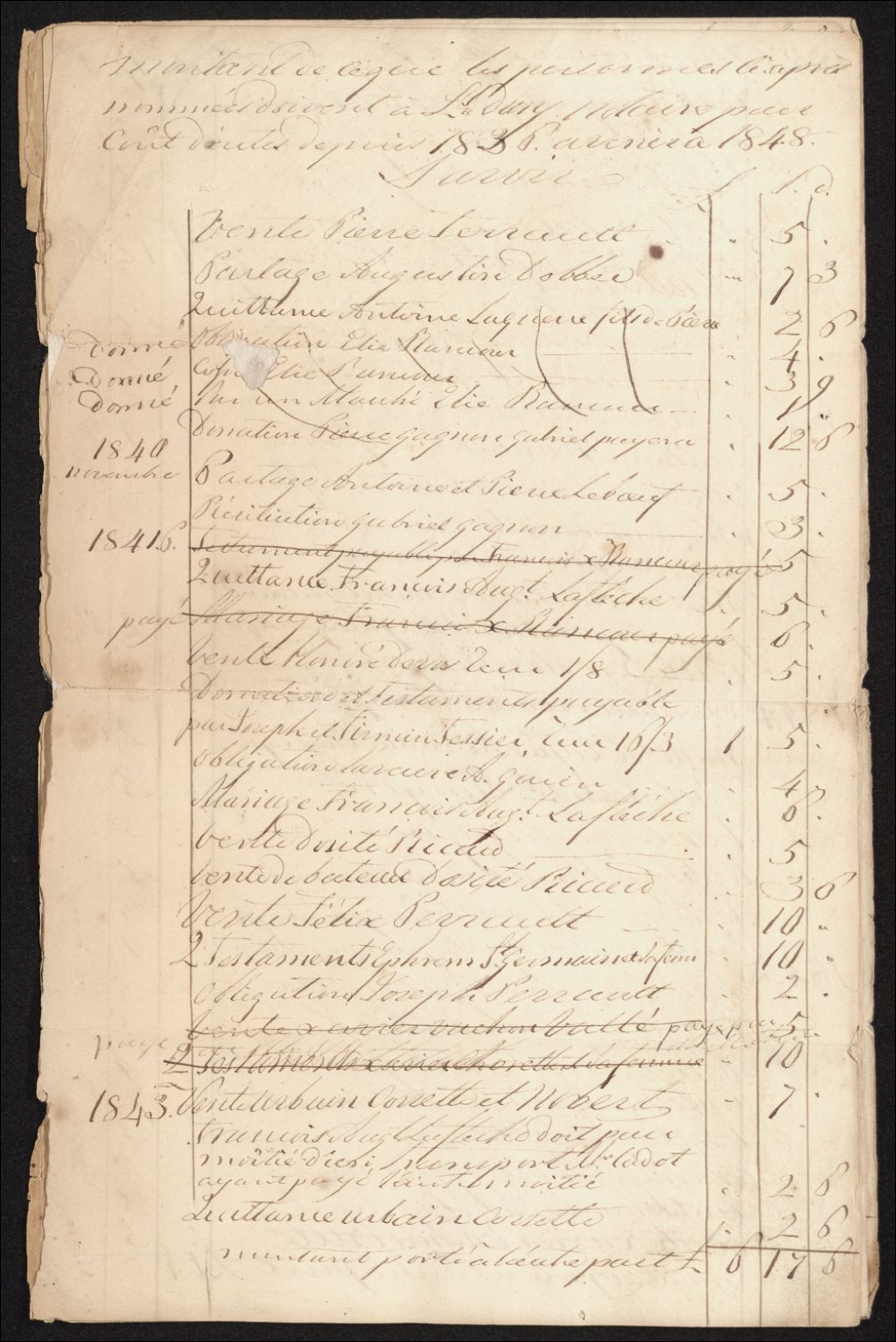 Compte (services juridiques de 1840 à 1848), 1848-01-01, Archives nationales à Trois-Rivières, Collection seigneuries Sainte-Anne et Sainte-Marie, (04T,P134,S2,SS6,D19).