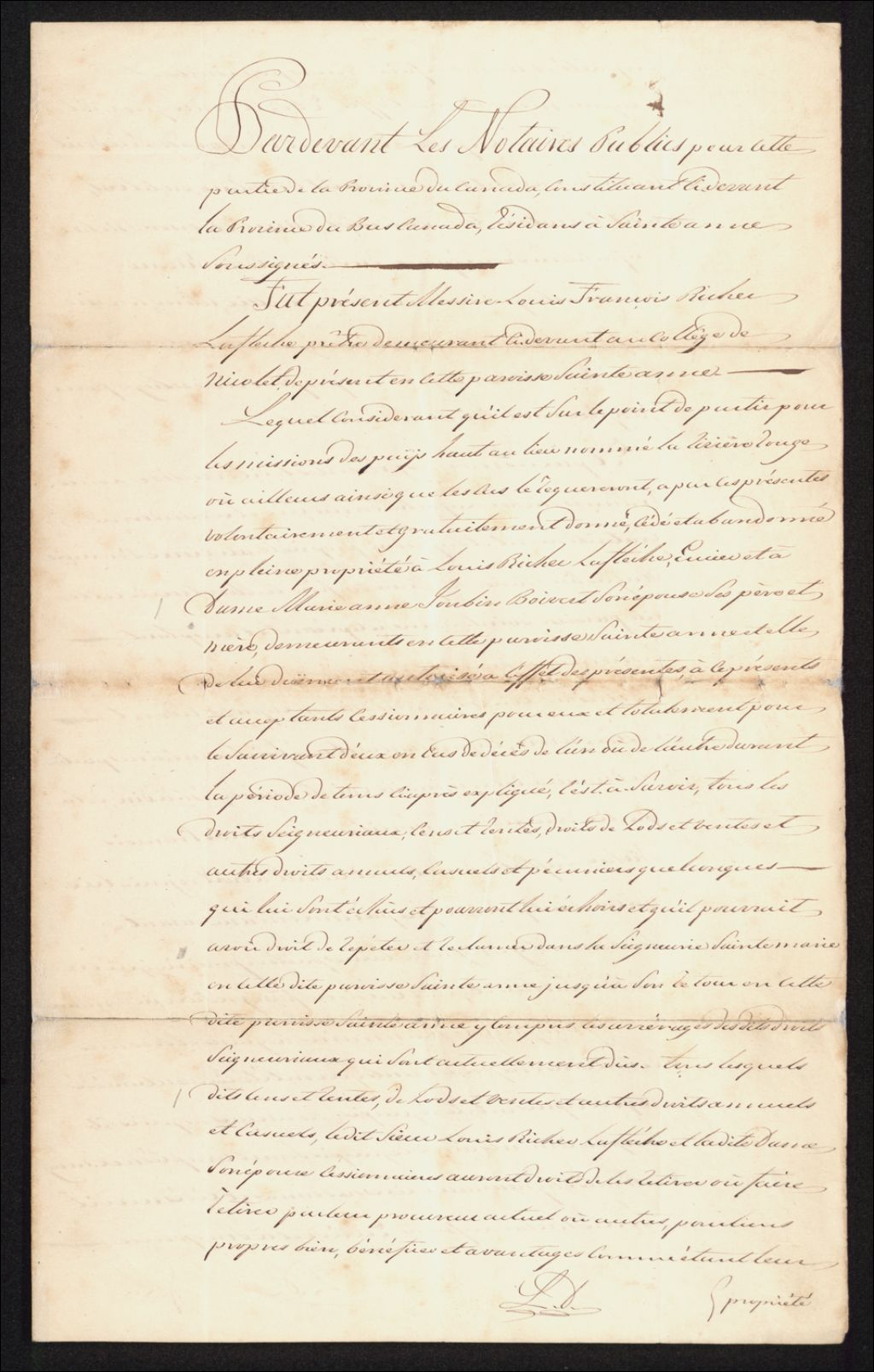 - Donation (droits seigneuriaux et départ pour évangélisation de Mgr. Laflèche) entre Louis Richer-Laflèche et René Cadot et Louis-François Richer-Laflèche, Louis et Augustin par Joseph-Casimir Dury, notaire