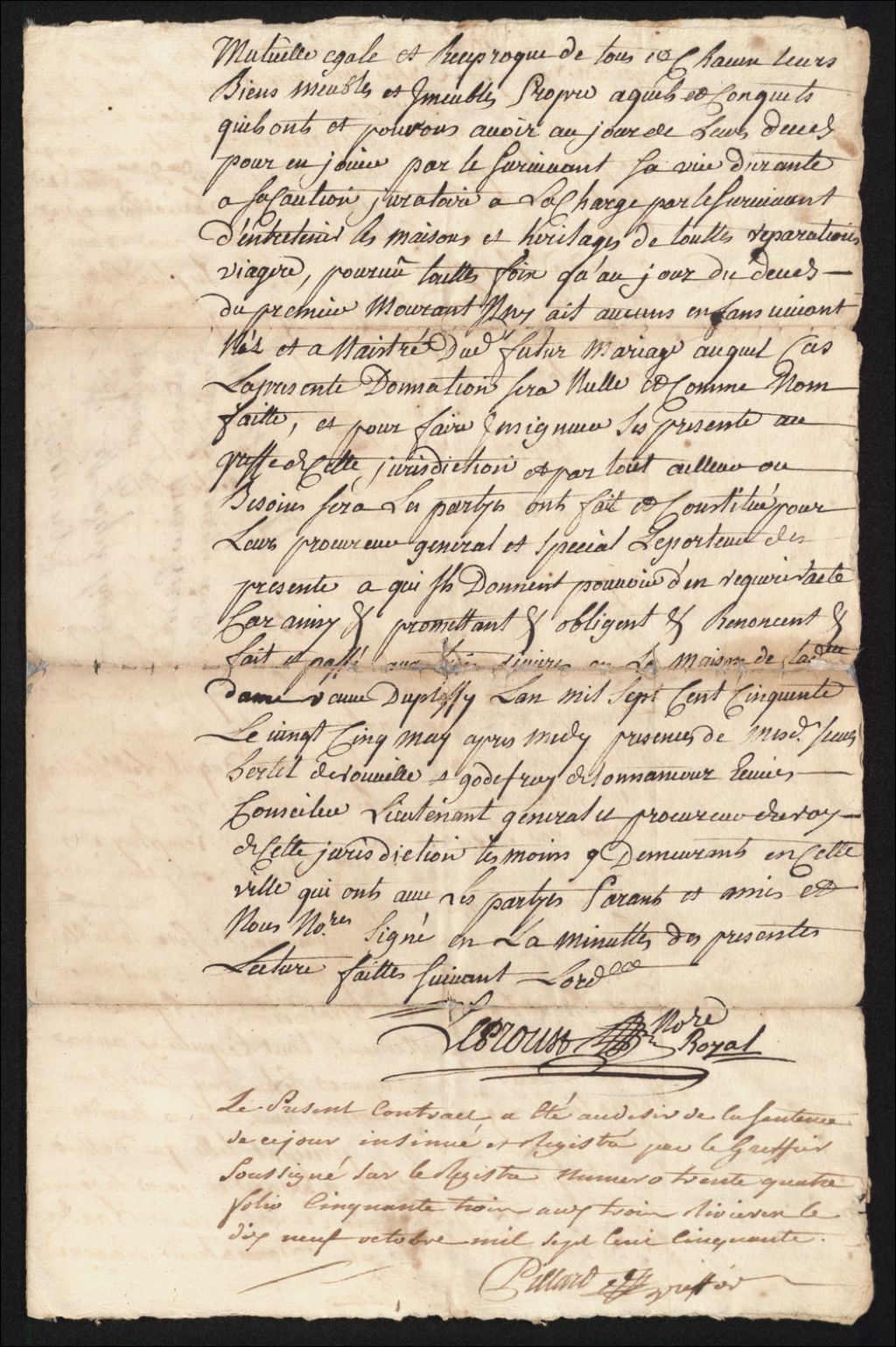 Contrat mariage (seigneurial avec annotations par le greffier Trois-Rivières le 19 octobre 1750)