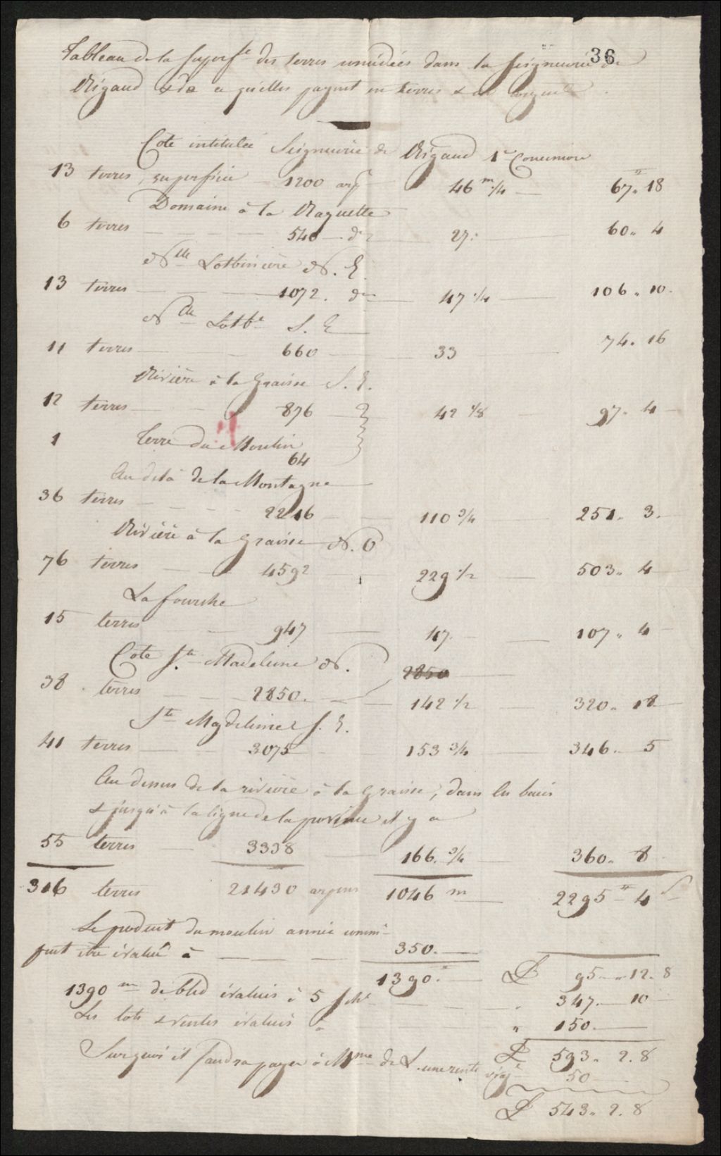 Tableau de la superficie des terres concédées dans la seigneurie de Rigaud et de ce qu’elles payent, 1828, Archives nationales à Québec, Fonds Famille Joly de Lotbinière, (03Q,P351,S3,P36).