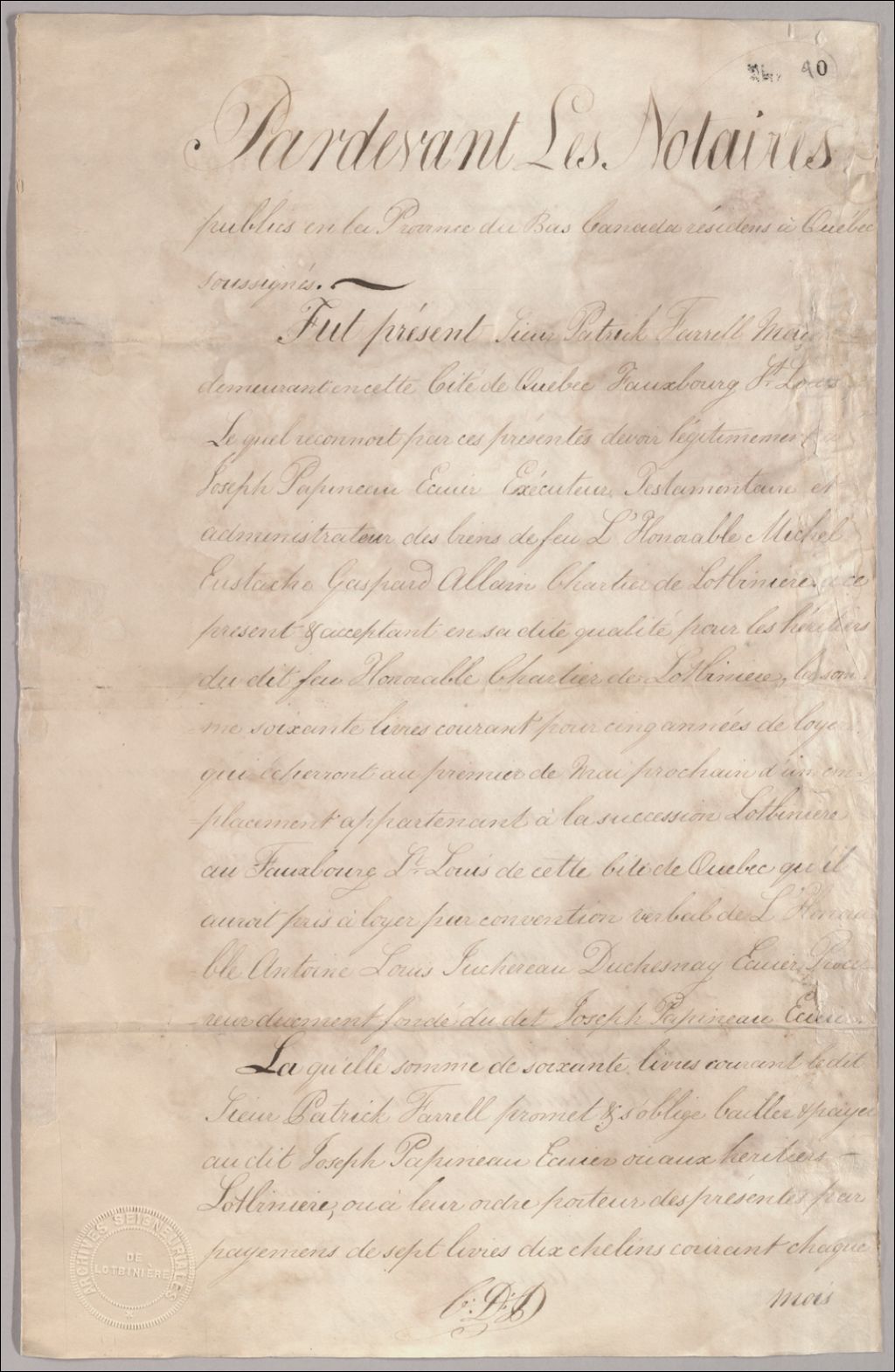 - Sur le même document, quittance d¿une partie de la somme par Patrick Farrell, 18 sept. 1829
