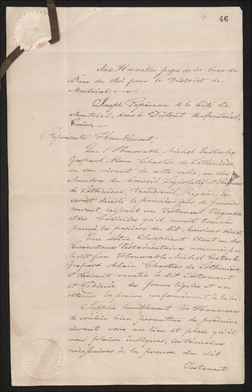 Requête présentée par Joseph Papineau au sujet du testament olographe et codicilles de Michel-Eustache-Gaspard- Alain Chartier de Lotbinière