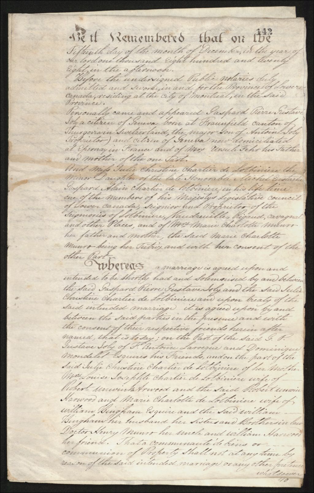 Contrat de mariage entre Pierre-Gustave Joly et Julie Christine Chartier de Lotbinière, 15 décembre 1828, Archives nationales à Québec, Fonds Famille Joly de Lotbinière, (03Q,P351,S3,P142).
