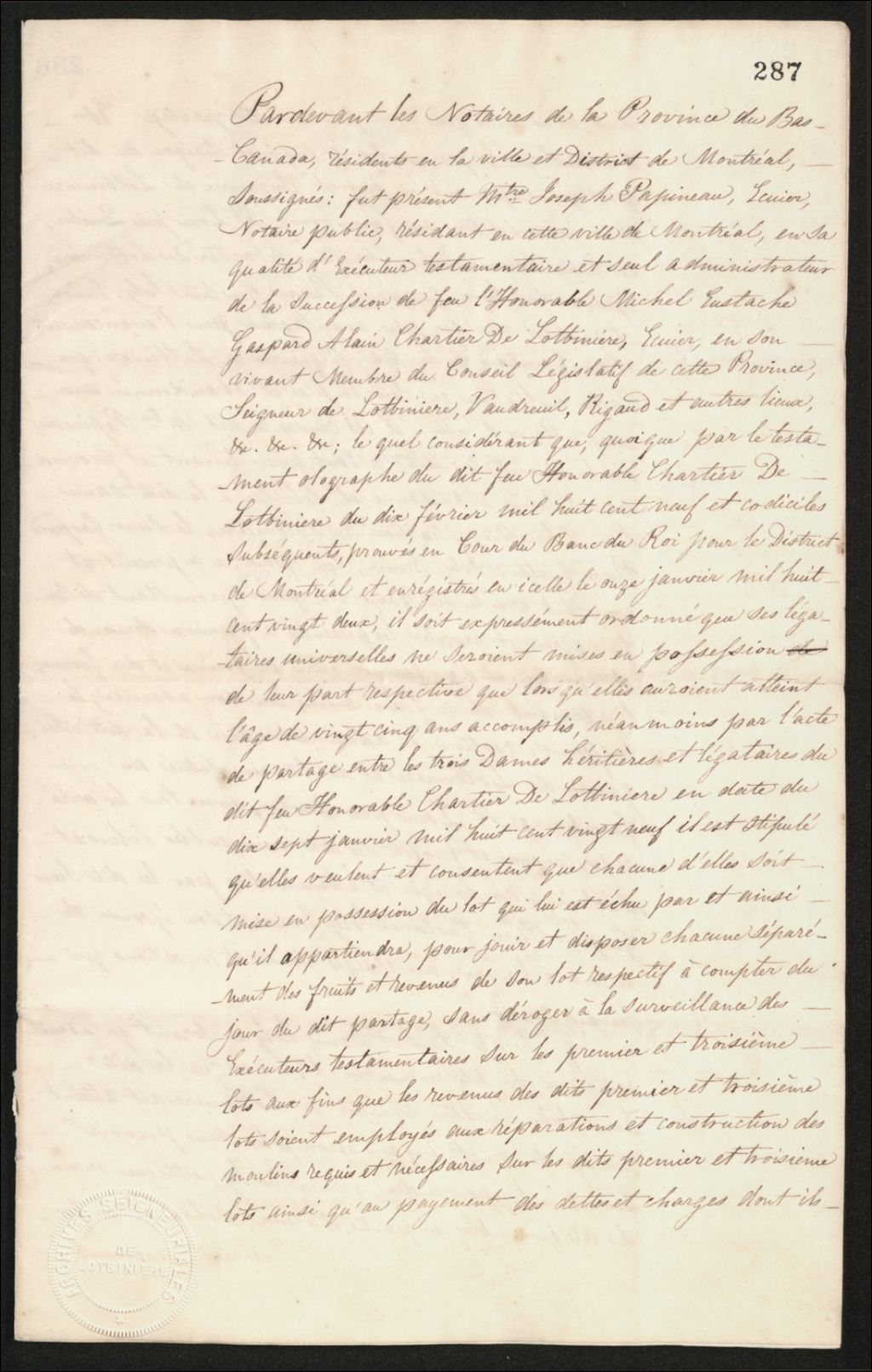 - Remise d’administration et gestion par Joseph Papineau, exécuteur testamentaire de feu Chartier de Lotbinière à Gustave Joly et Julie Chartier de Lotbinière son épouse