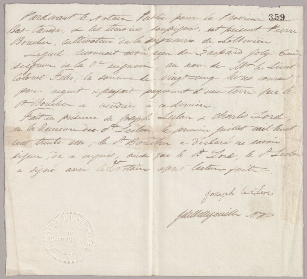 Quittance de Pierre Boucher à Gustave Joly, 1er juillet 1831, Archives nationales à Québec, Fonds Famille Joly de Lotbinière, (03Q,P351,S3,P359).