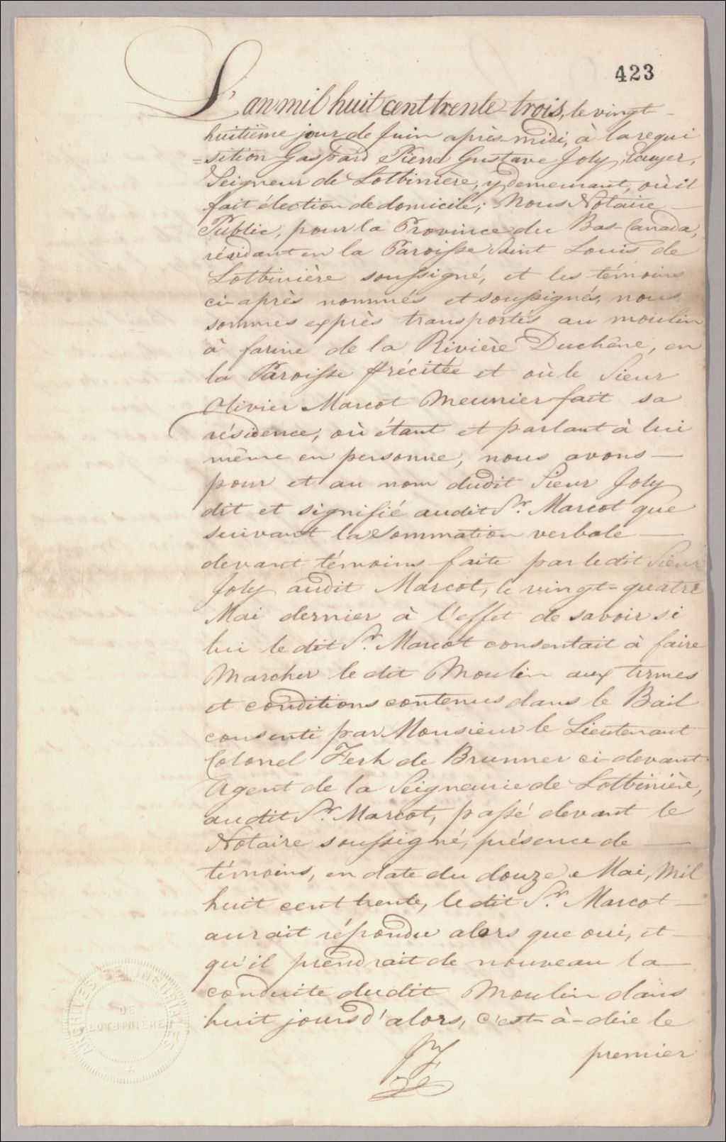 Protêt contre Olivier Marcot, meunier du moulin à farine de la rivière Duchêne, par Gustave Joly