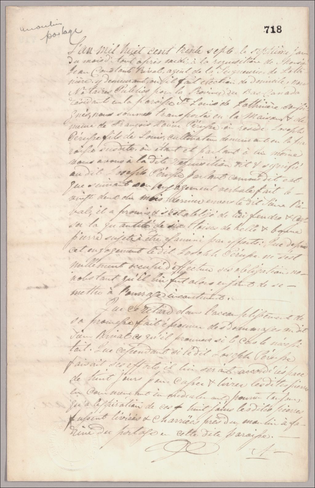 Protêt par Jean-Constant Rival contre Joseph Pérusse, 7 août 1837, Archives nationales à Québec, Fonds Famille Joly de Lotbinière, (03Q,P351,S3,P718).