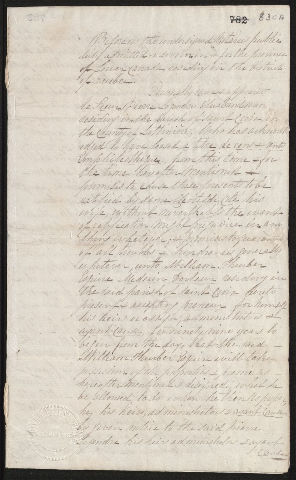Bail emphytéotique de Pierre Legendre à William Thurber. Ratification du bail, 8 février 1839, 3 octobre 1838, Archives nationales à Québec, Fonds Famille Joly de Lotbinière, (03Q,P351,S3,P830A).
