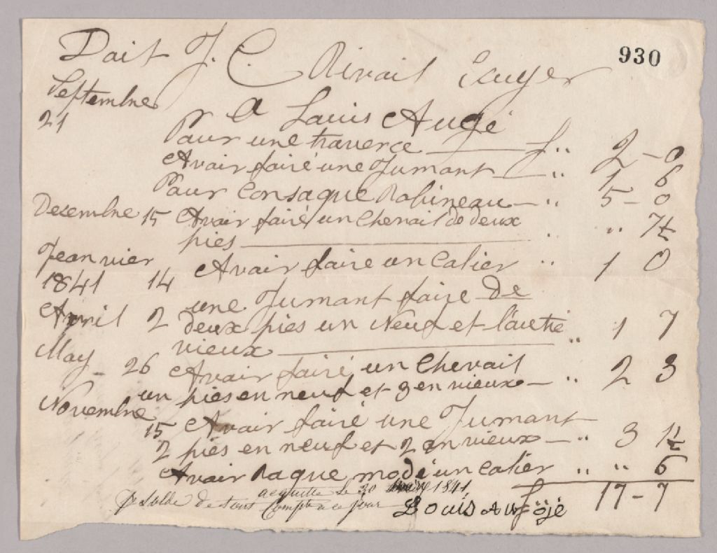 Compte acquitté de Louis Auger, 30 mars 1841, Archives nationales à Québec, Fonds Famille Joly de Lotbinière, (03Q,P351,S3,P930).