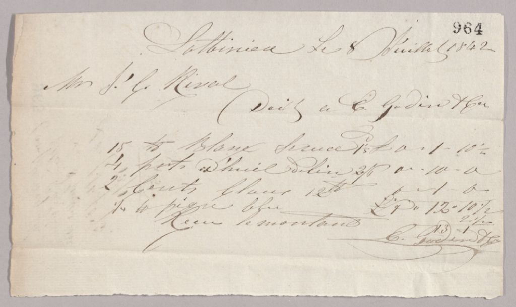 Compte acquitté d’Élie Godin & Cie, 8 juillet 1842, Archives nationales à Québec, Fonds Famille Joly de Lotbinière, (03Q,P351,S3,P964).