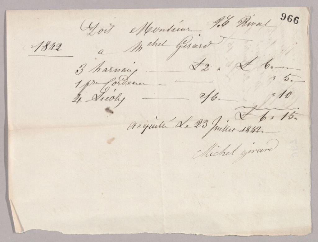 Compte acquitté de Michel Girard, 23 juillet 1842, Archives nationales à Québec, Fonds Famille Joly de Lotbinière, (03Q,P351,S3,P966).
