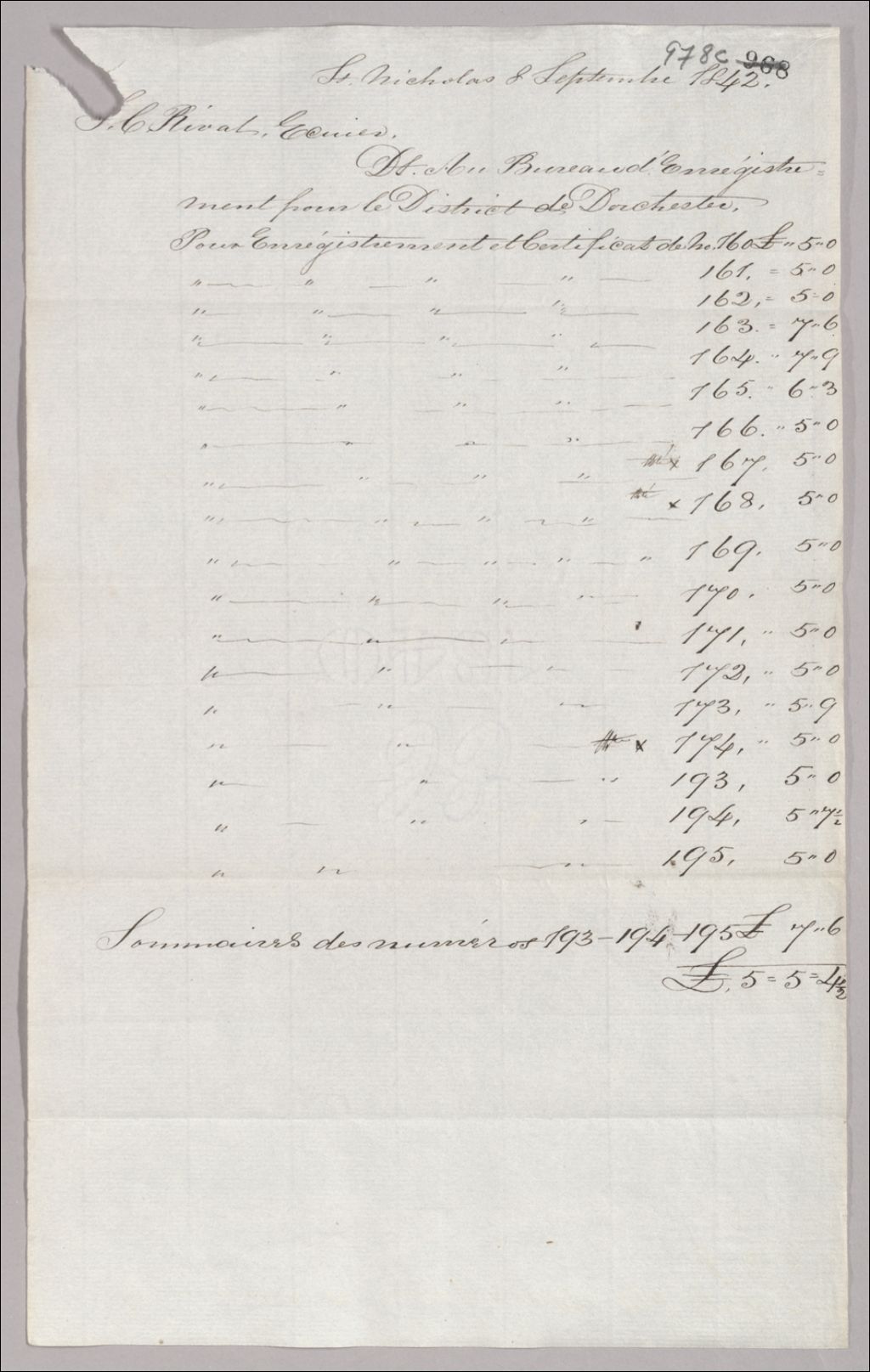 Compte acquitté du bureau d’enregistrement, district de Dorchester, 1842-1843, Archives nationales à Québec, Fonds Famille Joly de Lotbinière, (03Q,P351,S3,P978C).