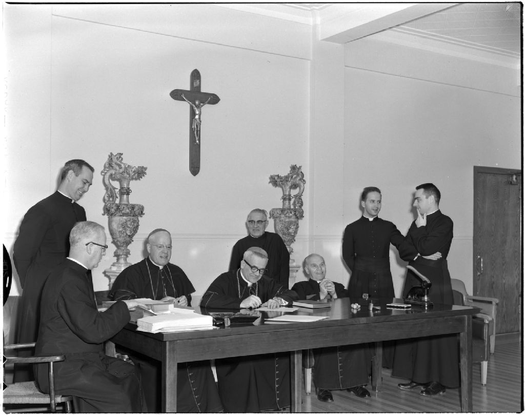 - Un groupe d'ecclésiatiques, aidé par des religieuses, prépare des valises contenant les documents devant servir la cause de la béatification de Jeanne Mance