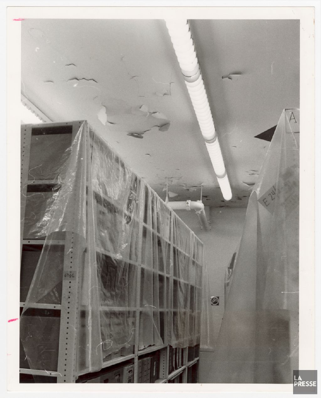 - Le dossier porte sur les dommages causés par un dégât d'eau au 100, rue Notre-Dame Est, dans les locaux des Archives nationales du Québec à Montréal en janvier 1987. On voit notamment l'archiviste Claude Minotto et des magasins endommagés.