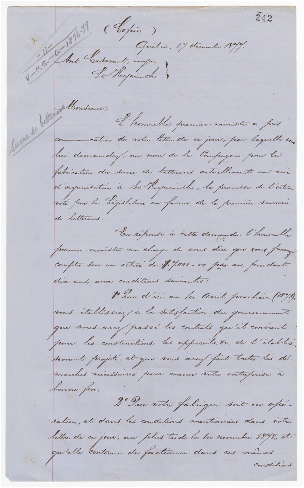 - Octroi du gouvernement pour une sucrerie de betteraves à Saint-Hyacinthe sur lequel il peut compter pendant dix ans moyennant certaines conditions