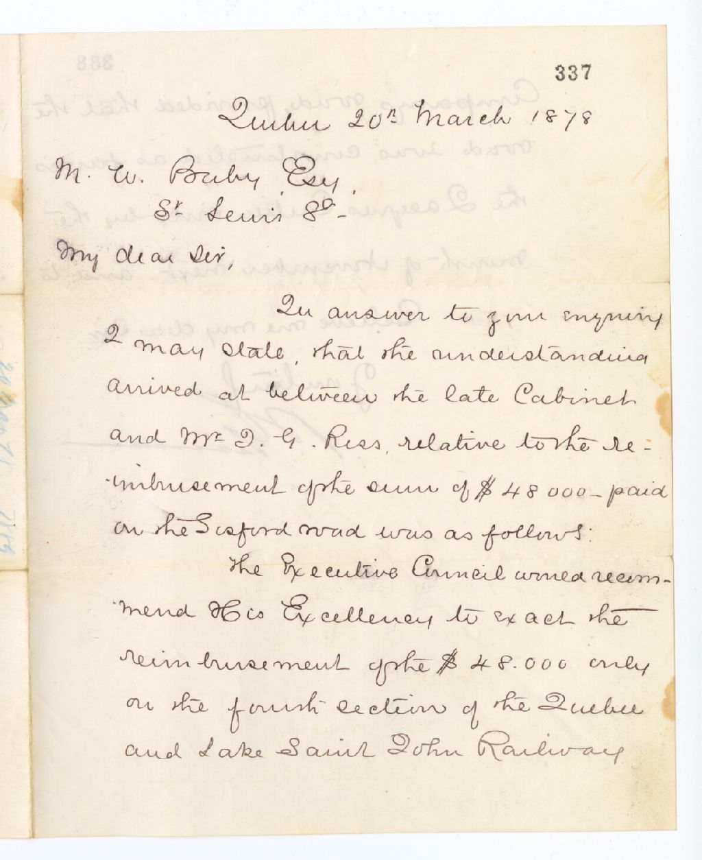 Lettre de P. Garneau à M. W. Baby, 20 mars 1878, Archives nationales à Québec, Fonds Famille Joly de Lotbinière, (03Q,P351,S4,SS1,P337).