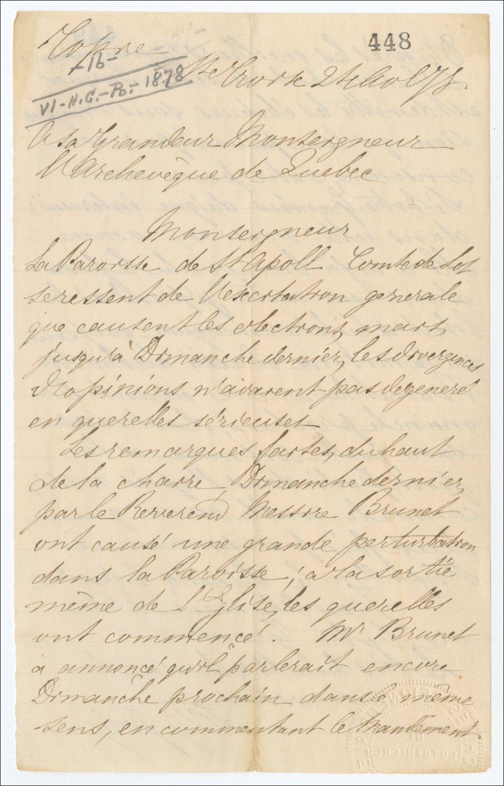 - Il lui demande d'intervenir auprès du curé Brunet, de la paroisse de Saint-Apollinaire, pour l'empêcher de se mêler de politique en chaire et ainsi éviter des querelles sérieuses. Les remarques du curé ont été faites dans le but de mettre les électeurs sous l'impression que, en conscience, ils ne peuvent voter pour lui
