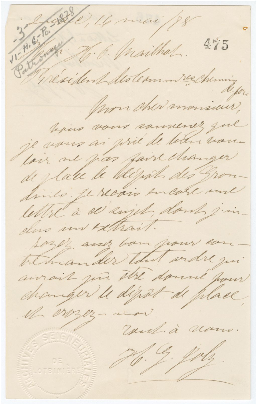 Lettre de Henri-Gustave Joly à H.-G. Malhiot, 16 mai 1878, Archives nationales à Québec, Fonds Famille Joly de Lotbinière, (03Q,P351,S4,SS1,P475).