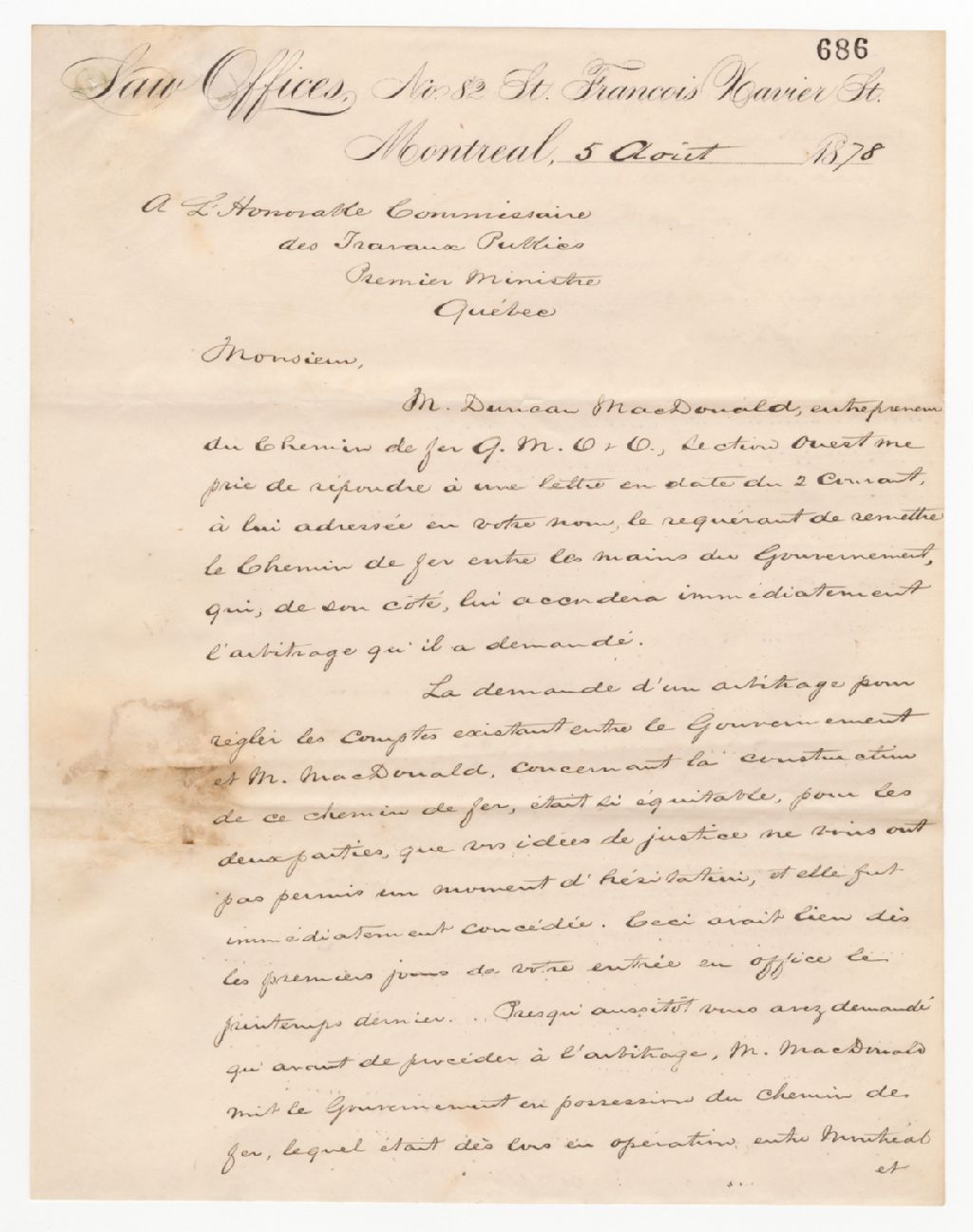 Lettre de Joseph Doutre à Henri-Gustave Joly, 5 août 1878, Archives nationales à Québec, Fonds Famille Joly de Lotbinière, (03Q,P351,S4,SS1,P686).