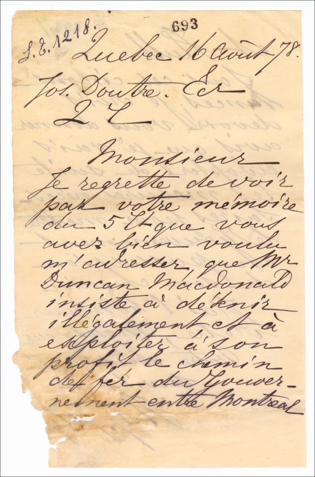 - Il regrette de voir que Duncan Macdonald insiste pour détenir illégalement, et exploite à son profit, le chemin de fer du gouvernement. Ce dernier prendra les mesures nécessaires pour entrer en possession de son bien