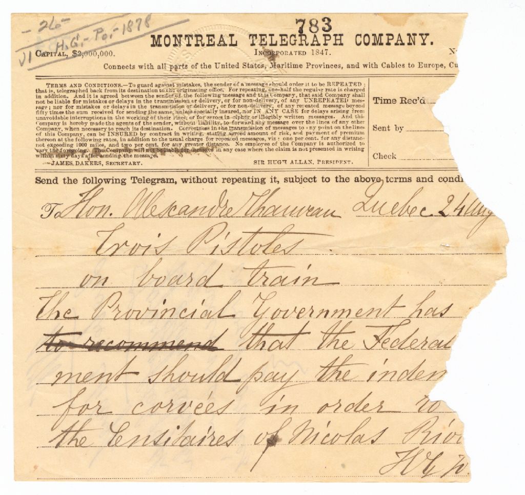 Télégramme de Henri-Gustave Joly à Alexandre Chauveau, 24 août 1878, Archives nationales à Québec, Fonds Famille Joly de Lotbinière, (03Q,P351,S4,SS1,P783).