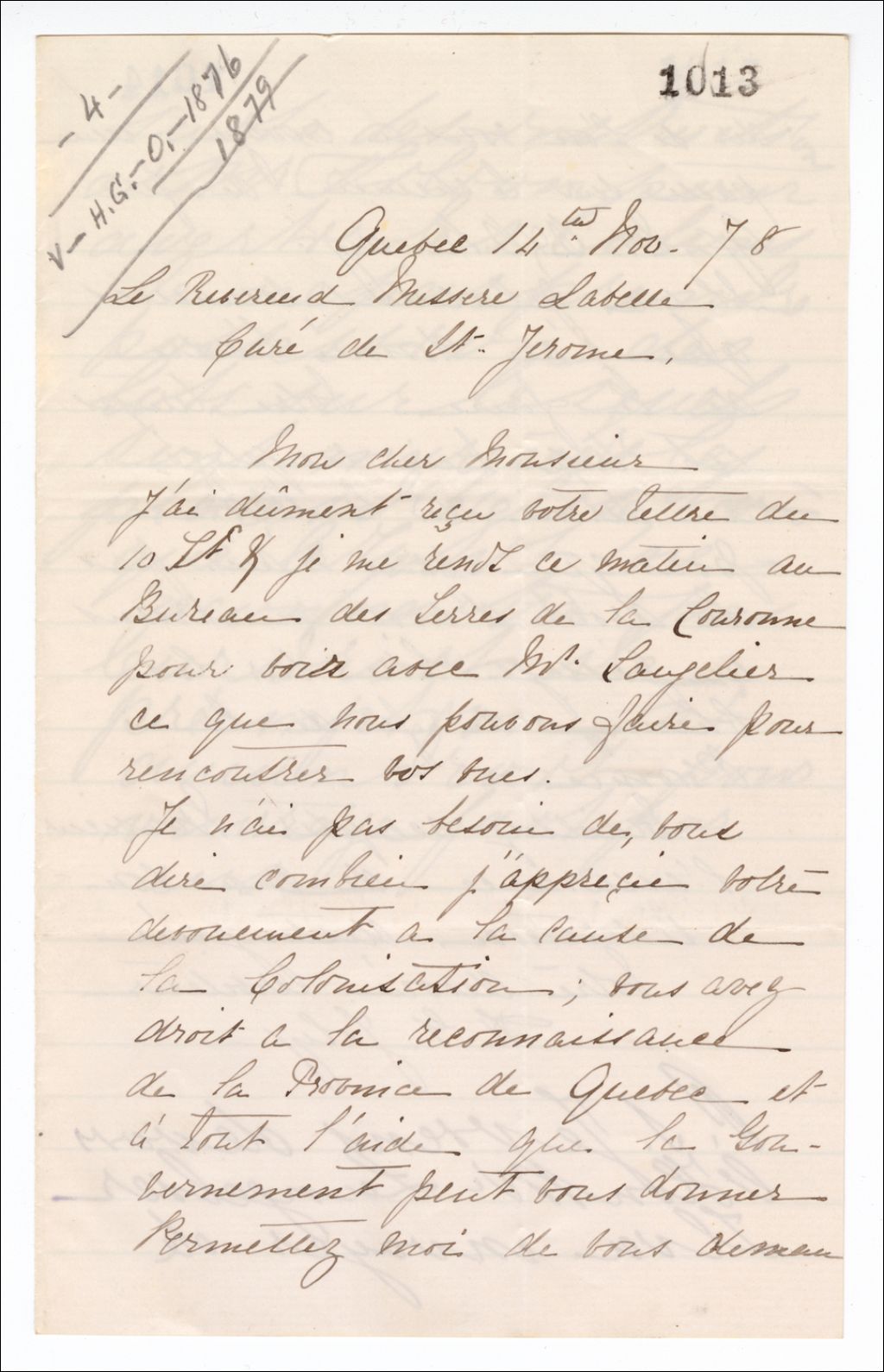Lettre de Henri-Gustave Joly au Curé A. Labelle (Antoine Labelle), 14 novembre 1878, Archives nationales à Québec, Fonds Famille Joly de Lotbinière, (03Q,P351,S4,SS1,P1013).