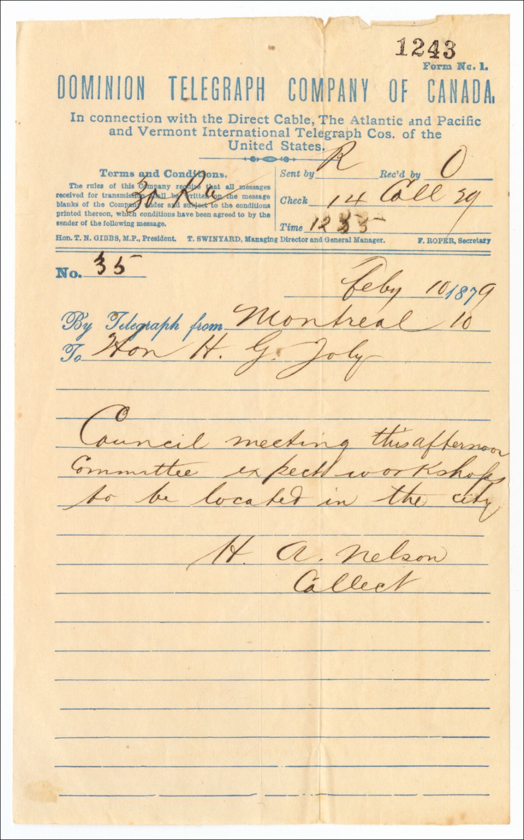 Télégramme de H. A. Nelson à Henri-Gustave Joly, 10 février 1879, Archives nationales à Québec, Fonds Famille Joly de Lotbinière, (03Q,P351,S4,SS1,P1243).