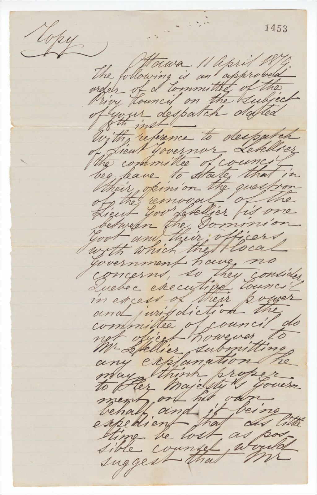 Copie d'un ordre du Conseil privé concernant l'affaire Letellier de Saint-Just, 11 avril 1879, Archives nationales à Québec, Fonds Famille Joly de Lotbinière, (03Q,P351,S4,SS1,P1453).