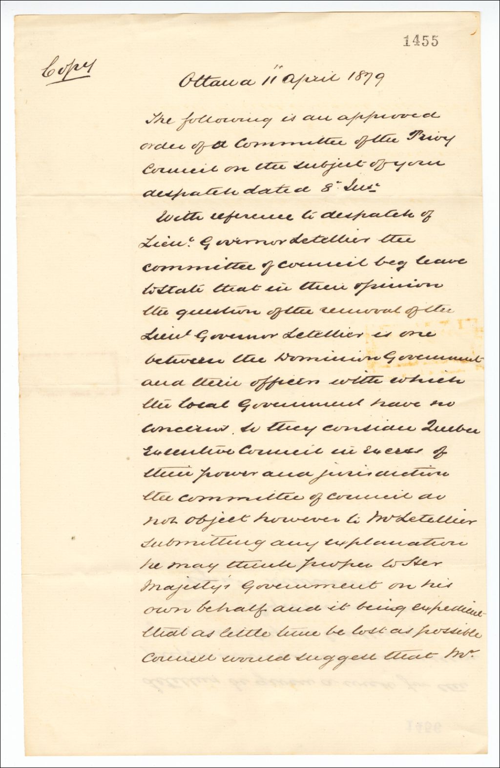 Copie du document précédent [Copie d'un ordre du Conseil privé concernant l'affaire Letellier de Saint-Just], vers 1879, Archives nationales à Québec, Fonds Famille Joly de Lotbinière, (03Q,P351,S4,SS1,P1455).
