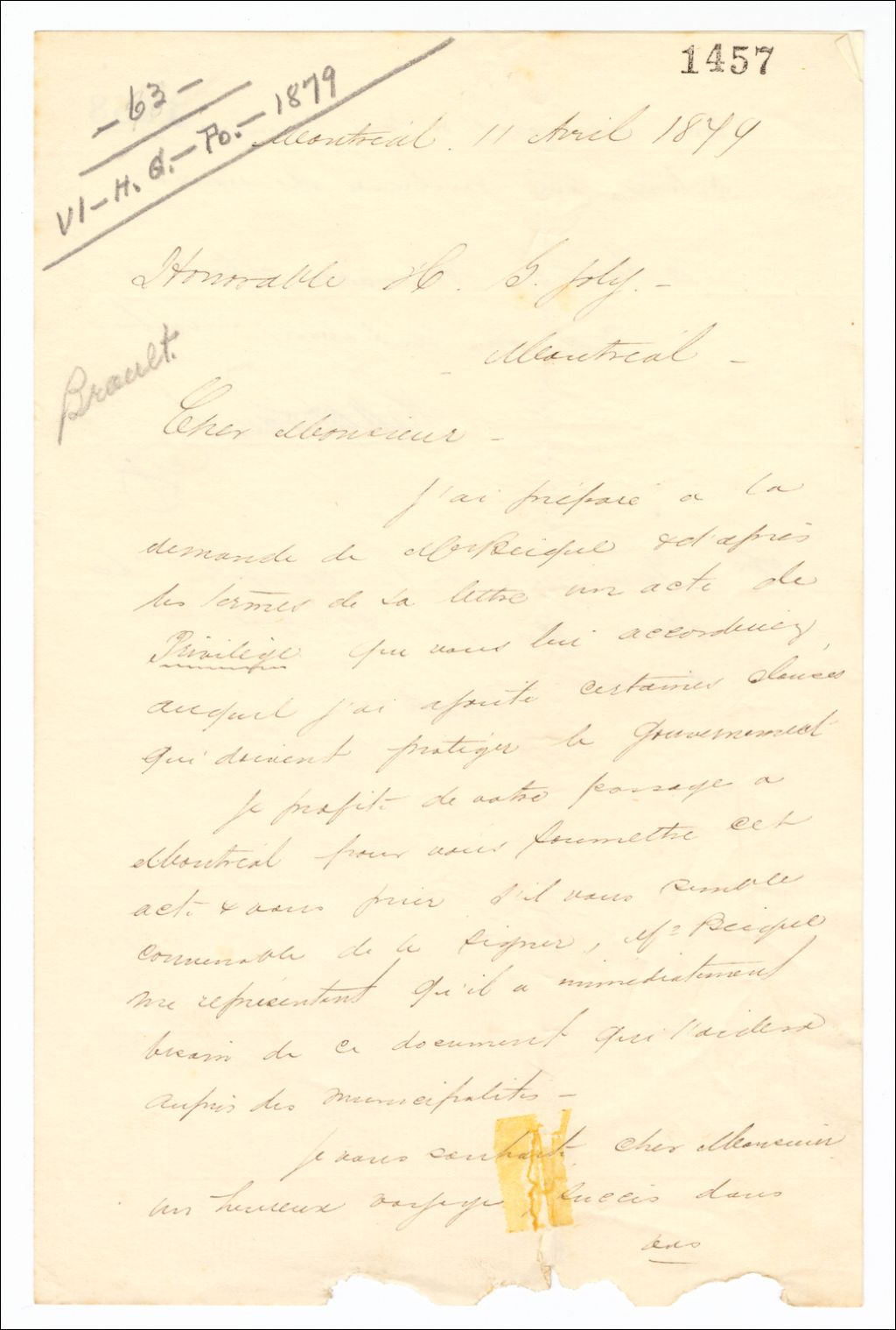 - Il a préparé à la demande de Béique un acte de privilège. A ajouté certaines clauses pour protéger le Gouvernement. Si l'acte lui convient, demande de le signer. Béique a besoin de ce document qui l'aidera auprès des municipalités. Souhaite un heureux voyage et du succès dans ses missions