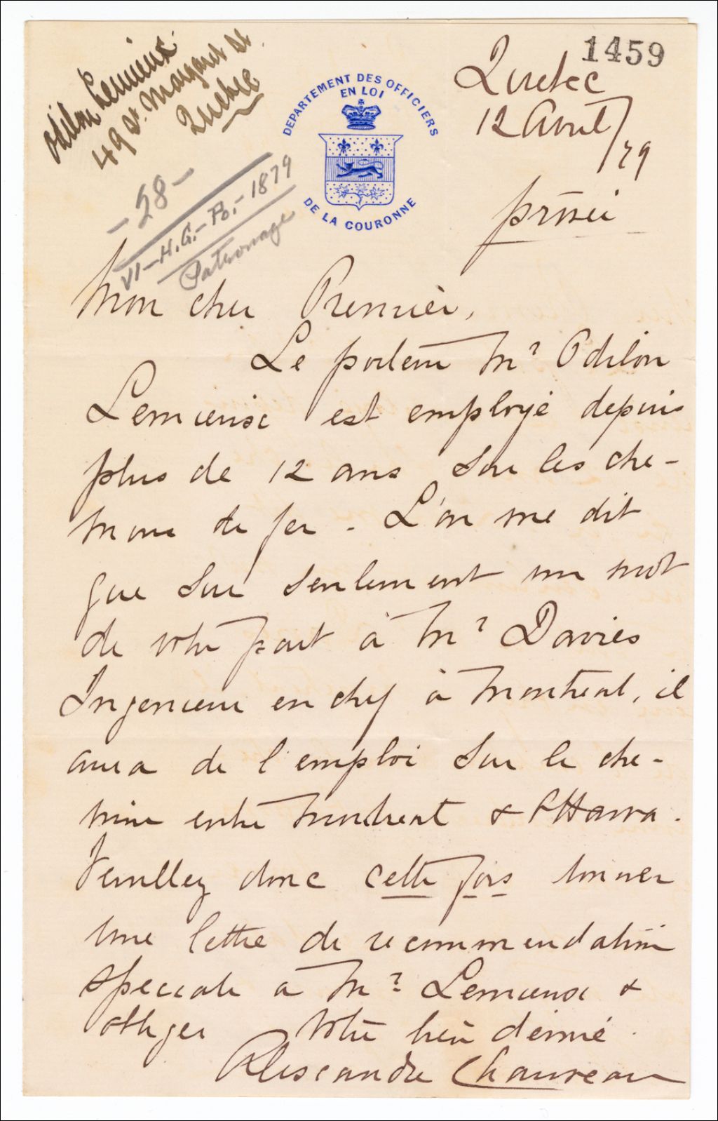 - Recommande Odilon Lemieux pour un emploi sur le chemin de fer Montréal-Ottawa. Sur la même lettre Henri-Gustave Joly à Monsieur Scott demandant de donner un essai au porteur de la lettre, s'il y a du travail