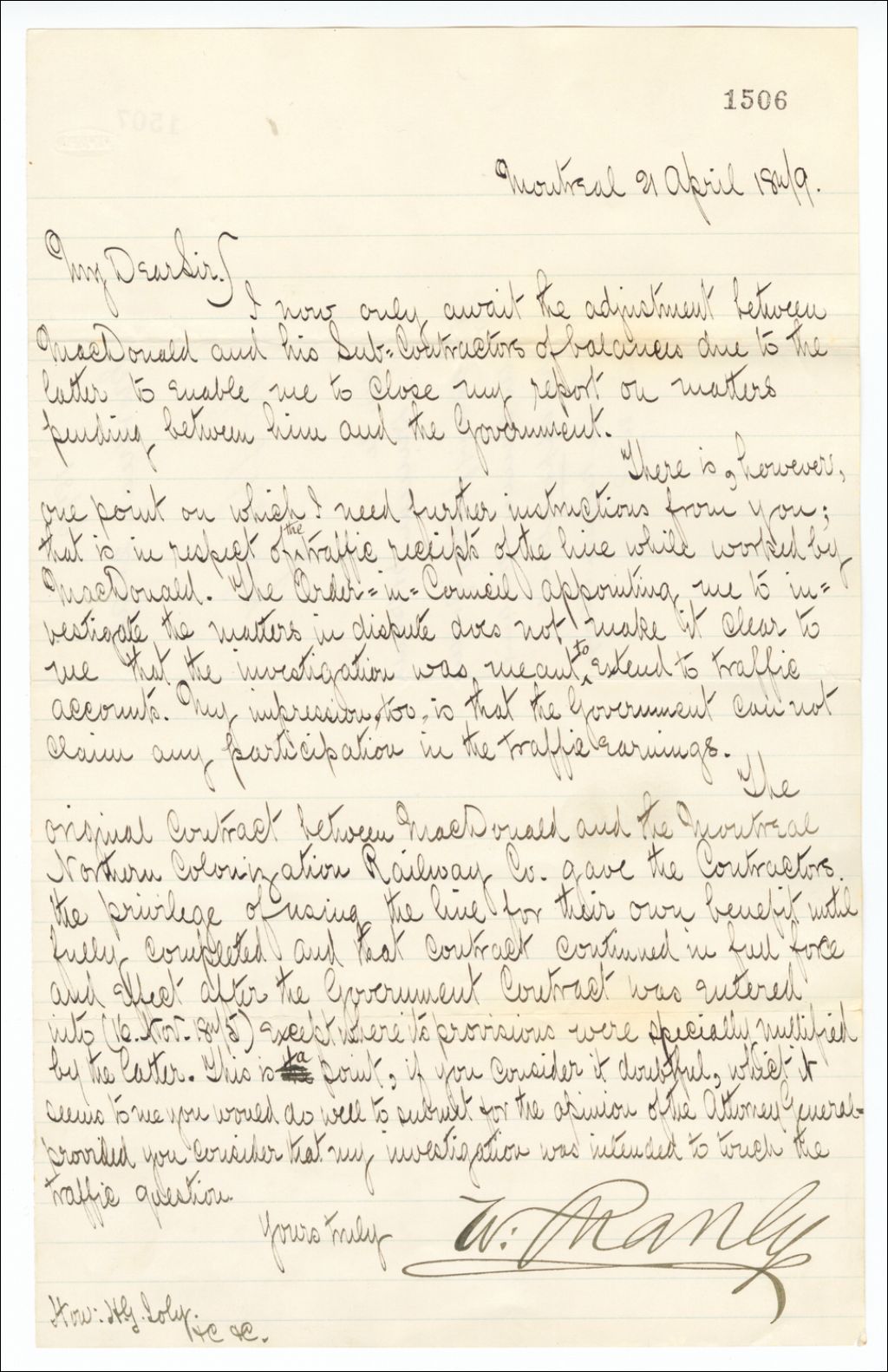 Lettre de W. Shanly à Henri-Gustave Joly, 21 avril 1879, Archives nationales à Québec, Fonds Famille Joly de Lotbinière, (03Q,P351,S4,SS1,P1506).
