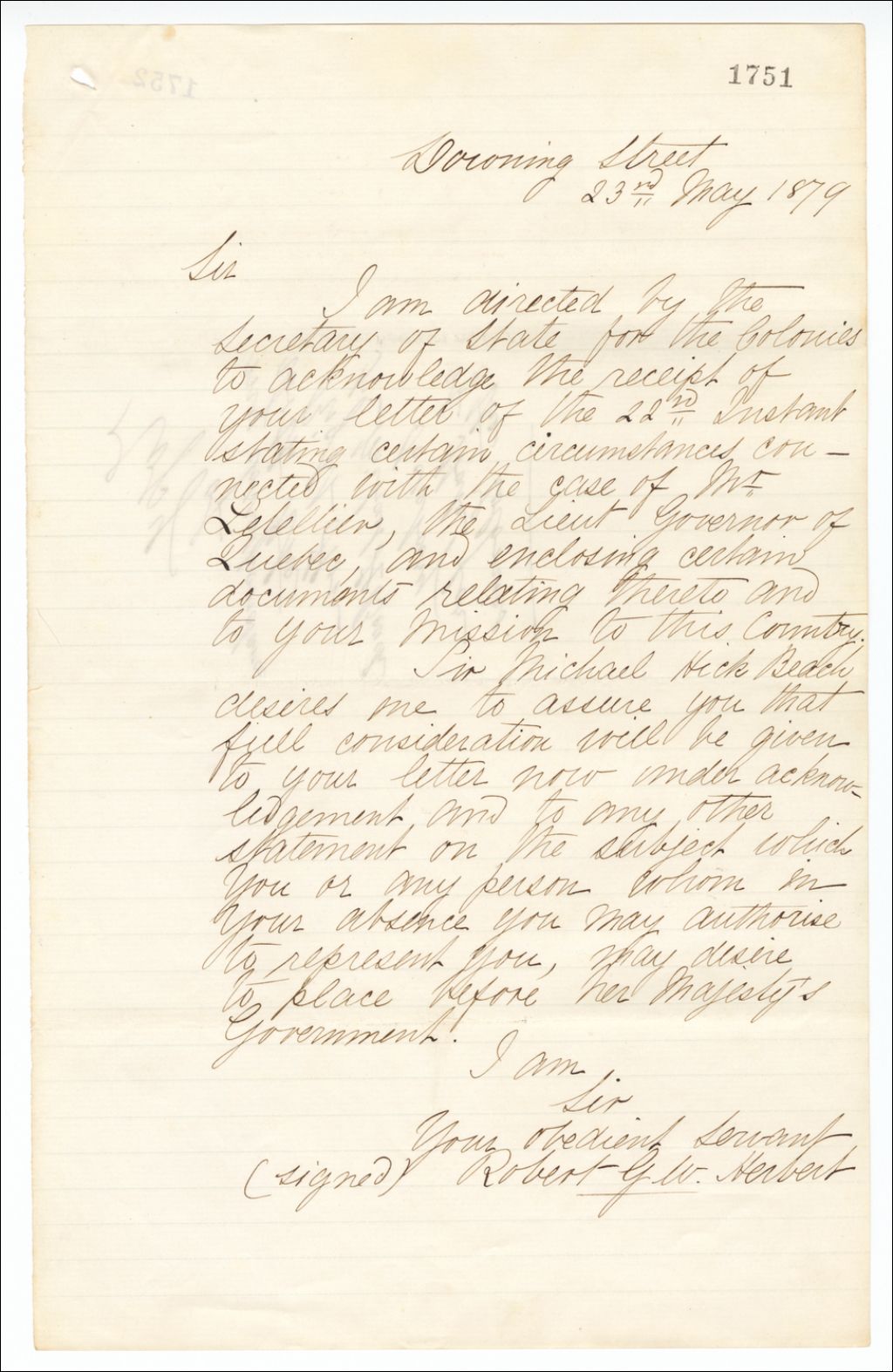 - Accuse réception au nom du secrétaire des colonies des documents. Affaire Letellier. Sir Michael Hicks Beach l'assure qu'il prendra cela en considération