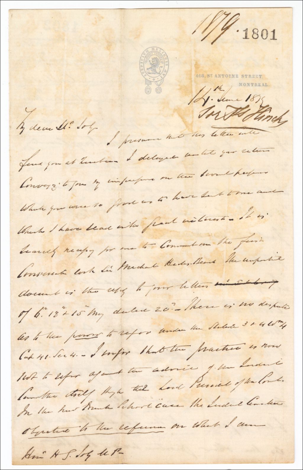 - Lettre de Sir Francis Hincks à Henri-Gustave Joly