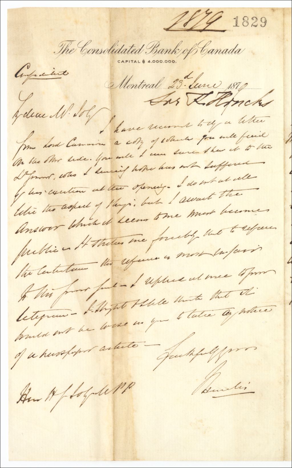 Lettre de Sir Francis Hincks à Henri-Gustave Joly, 23 juin 1879, Archives nationales à Québec, Fonds Famille Joly de Lotbinière, (03Q,P351,S4,SS1,P1829).