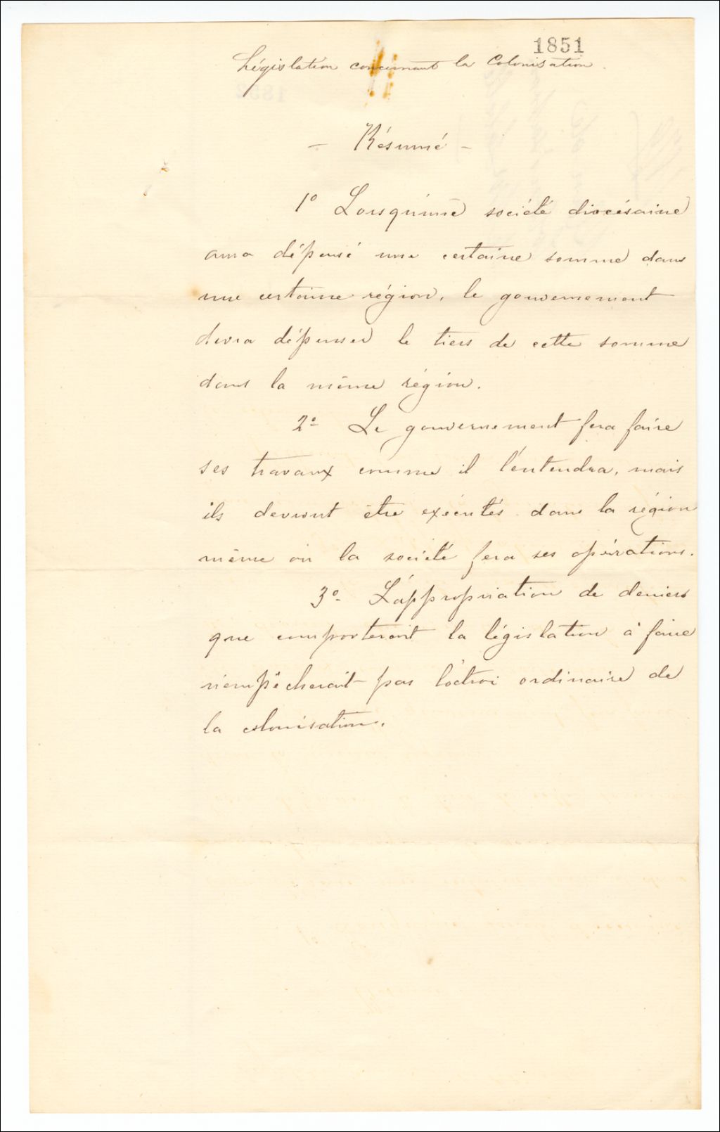Résumé du plan de colonisation du curé Labelle, juillet 1879, Archives nationales à Québec, Fonds Famille Joly de Lotbinière, (03Q,P351,S4,SS1,P1851).