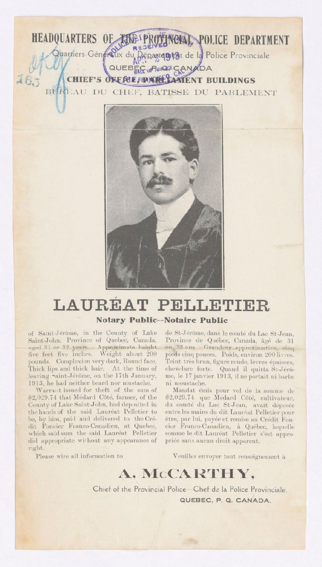 Lauréat Pelletier, notary public of Saint-Jérôme, in the County of Lake Saint-John, Province of Quebec, Canada, aged 31 or 32 years ... = Lauréat Pelletier, notaire public de Saint-Jérôme dans le comté du Lac St-Jean, Province de Québec, Canada, âgé de 31 ou 32 ans ...