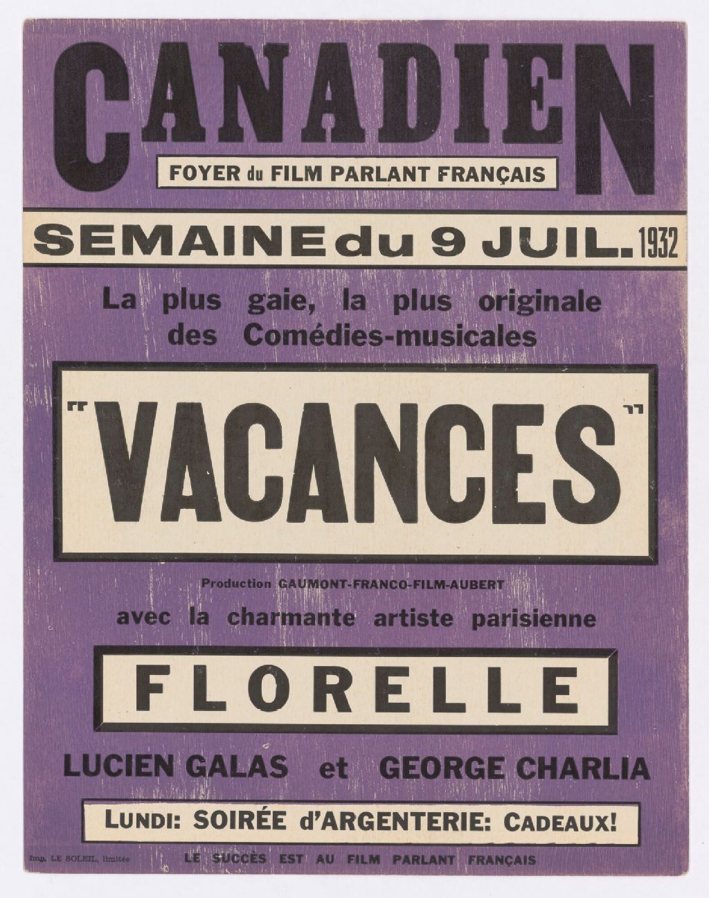 Semaine du 9 juil. 1932, la plus gaie, la plus originale des comédies-musicales, "Vacances", production Gaumont-Franco-Film-Aubert, avec la charmante artiste parisienne Florelle, Lucien Galas et George Charlia ...