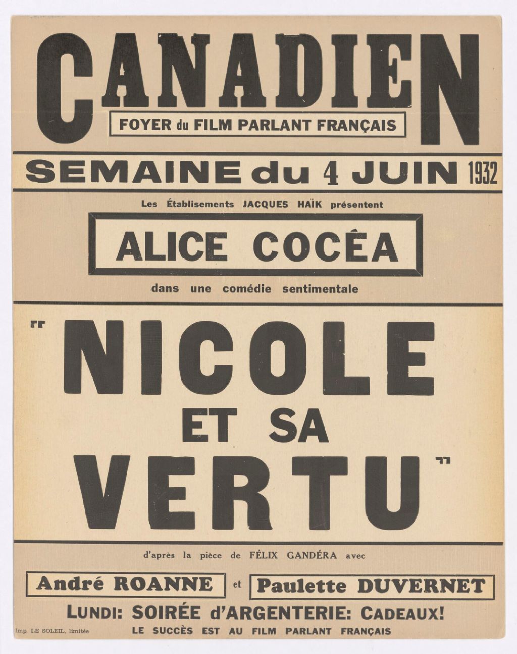 Semaine du 4 juin 1932, Les Établissements Jacques Haïk présentent Alice Cocéa dans une comédie sentimentale, "Nicole et sa vertu", d'après la pièce de Félix Gandéra, avec André Roanne et Paulette Duvernet ...