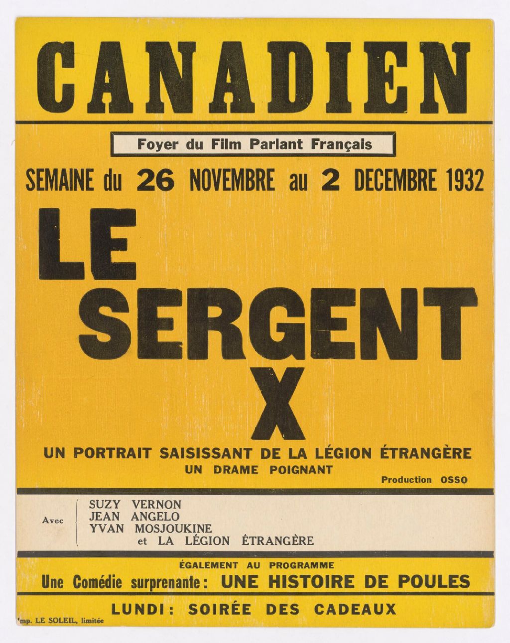 Semaine du 26 novembre au 2 décembre 1932, Le sergent X, un portrait saisissant de la Légion étrangère, un drame poignant, avec Suzy Vernon, Jean Angelo, Yvan Mosjoukine et la Légion étrangère : également au programme, une comédie surprenante: Une histoire de poules ...