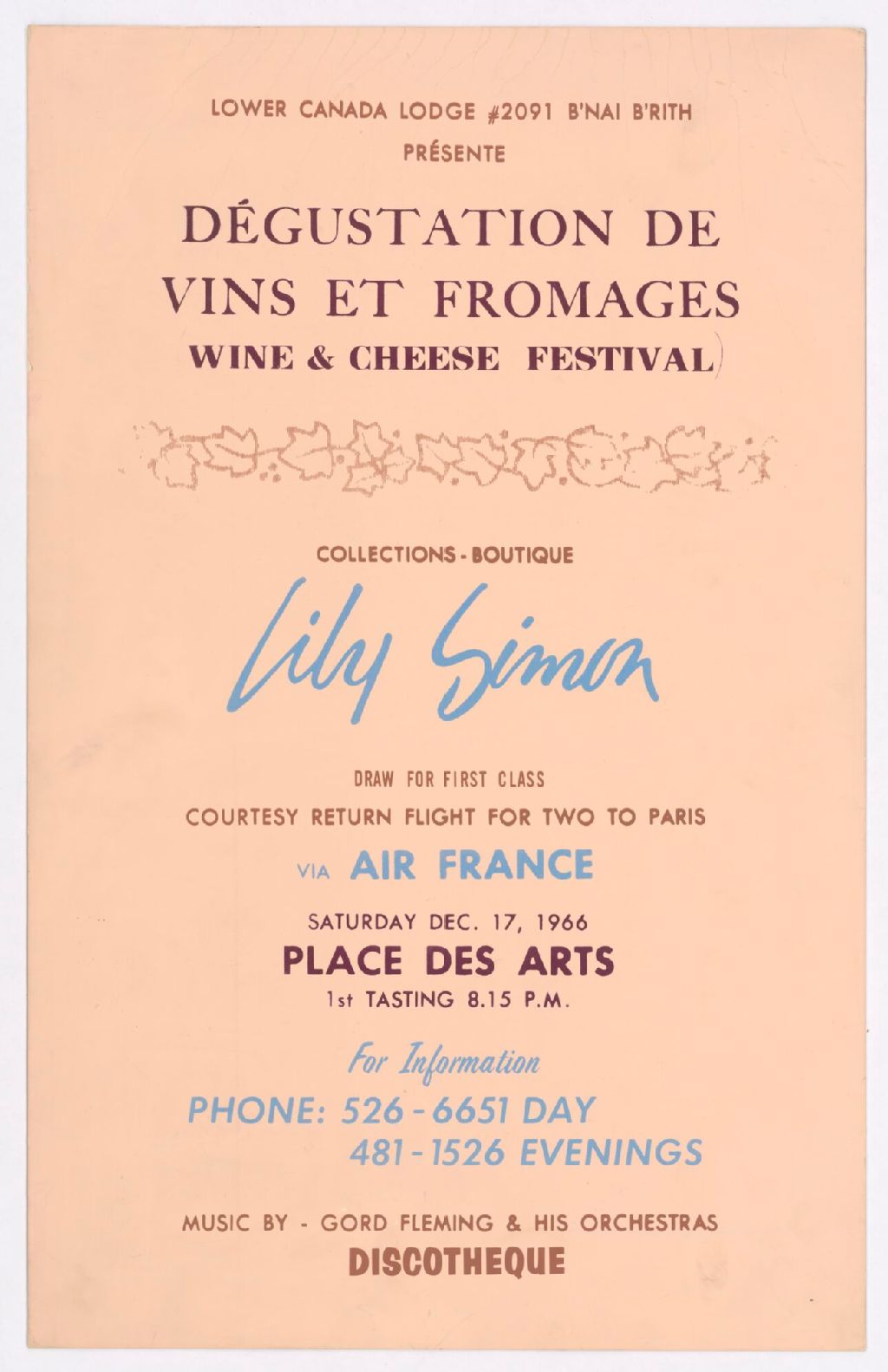 Lower Canada Lodge #2091 B'nai B'rith présente [une] dégustation de vins et fromage, collections-boutique Lily Simon, draw for first class... return flight for two to Paris