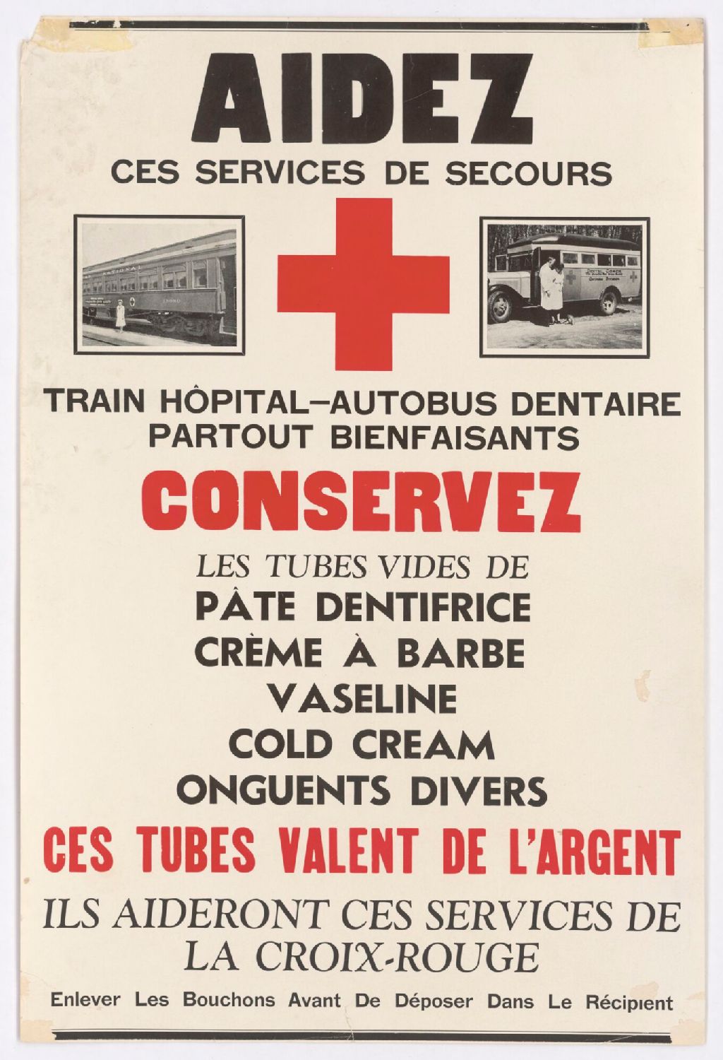 Aidez ces services de secours, train hôpital [et] autobus dentaire partout bienfaisants conservez les tubes vides de pâte dentifrice, crème à barbe, vaseline, cold cream, onguents divers, ces tubes valent de l'argent ...
