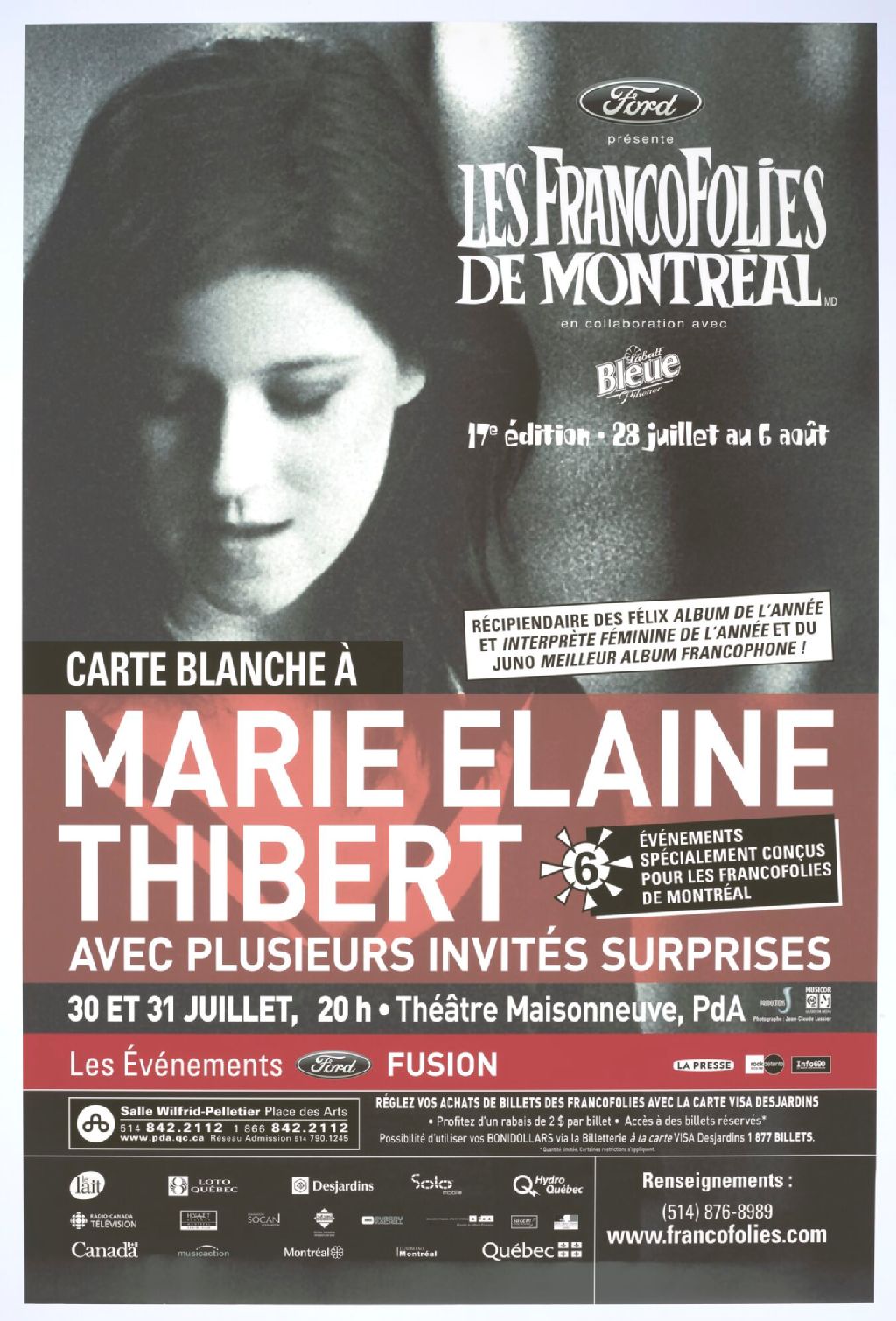 Carte blanche à Marie Élaine Thibert avec plusieurs invités surprises récipiendiare des Félix... : les Événements Ford Fusion... : 6 événements spécialement conçus pour les Francofolies...