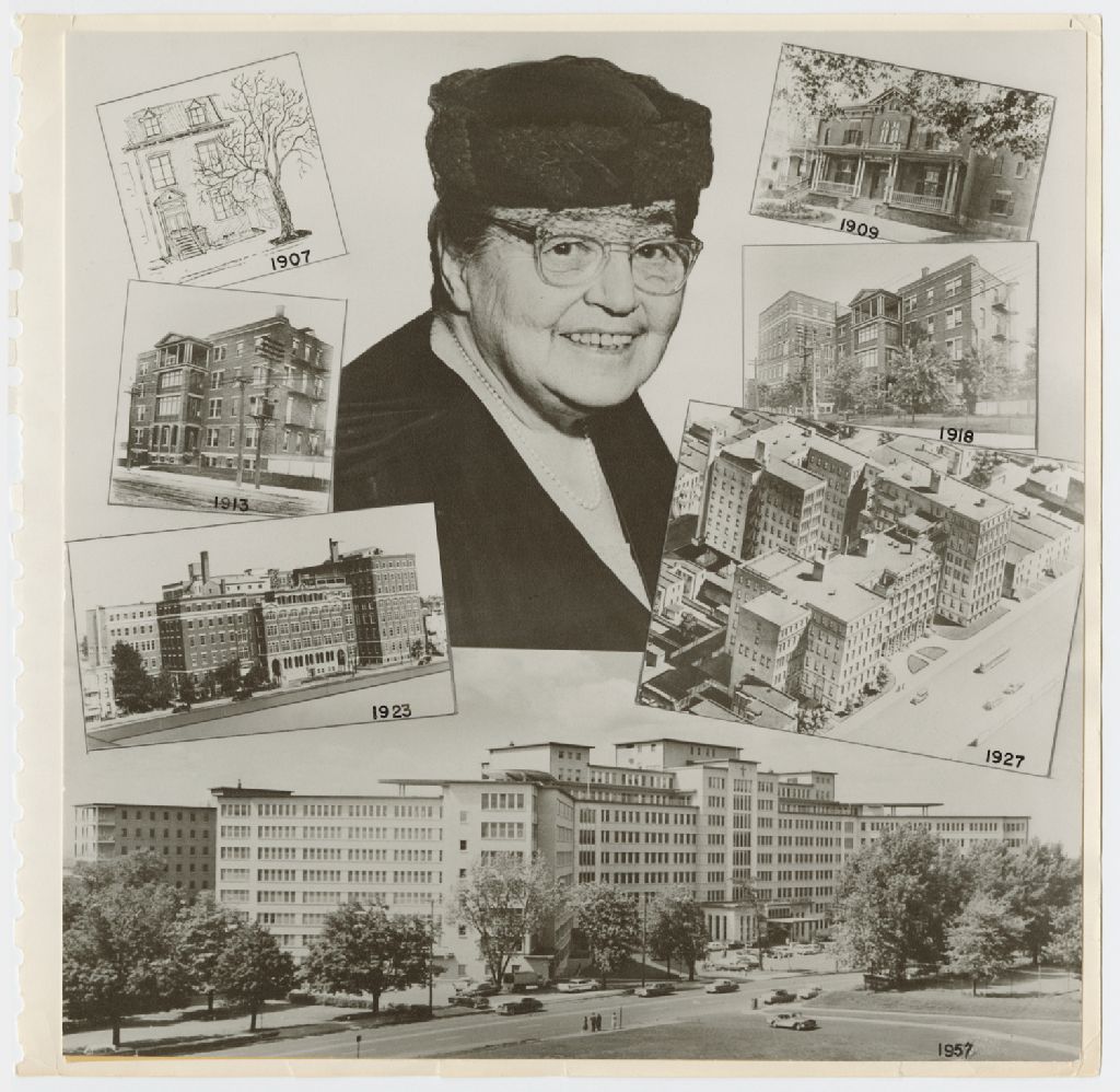 Un montage nous montre Justine Lacoste Beabien et les différents bâtiments occupés par l'Hôpital Sainte-Justine en 1907, 1909, 1913, 1918, 1923, 1927 et 1957