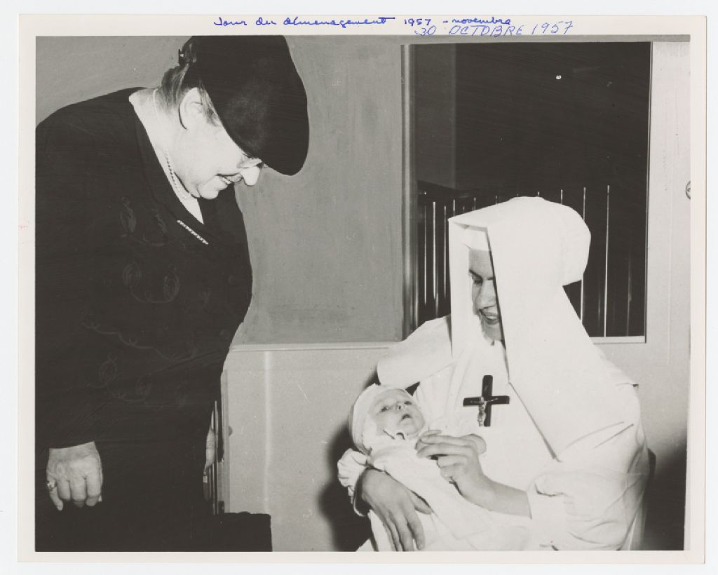 À l'occasion du déménagement, Soeur Marie-Thérèse console un enfant hospitalisé sous le regard de Justine Lacoste Beaubien