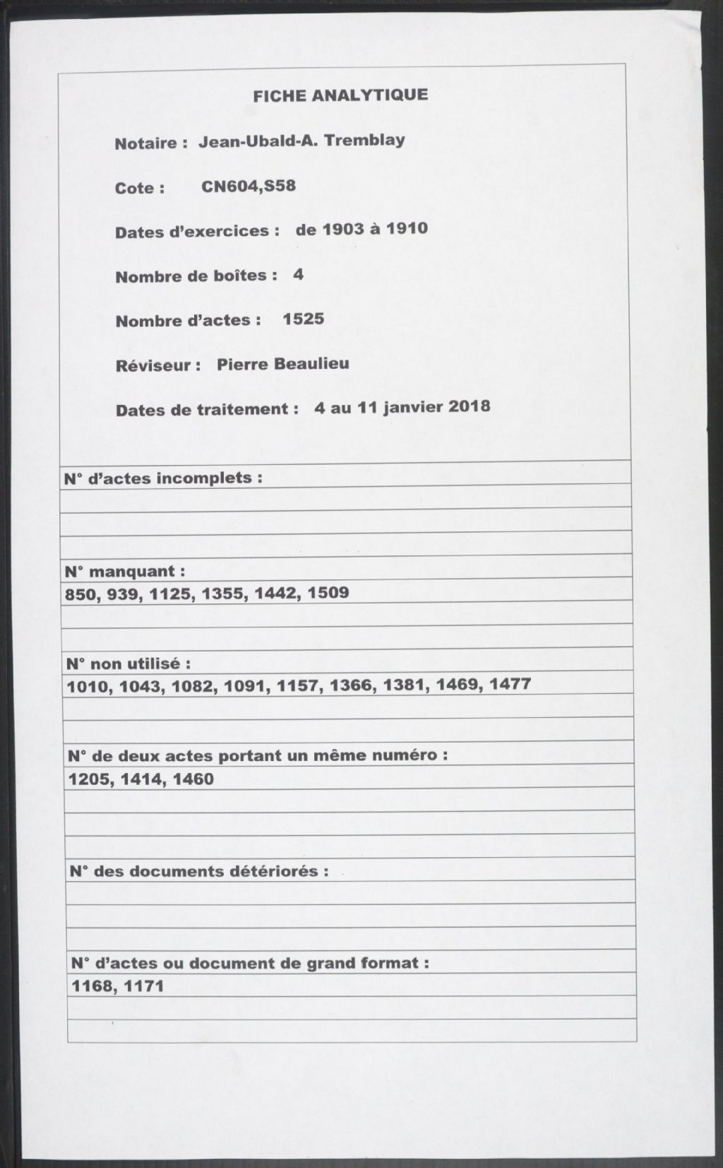 Jean-Ubald-A. Tremblay, 1903-1910, Archives nationales à Montréal, Fonds Cour supérieure. District judiciaire d'Iberville. Greffes de notaires, (06M,CN604,S58).