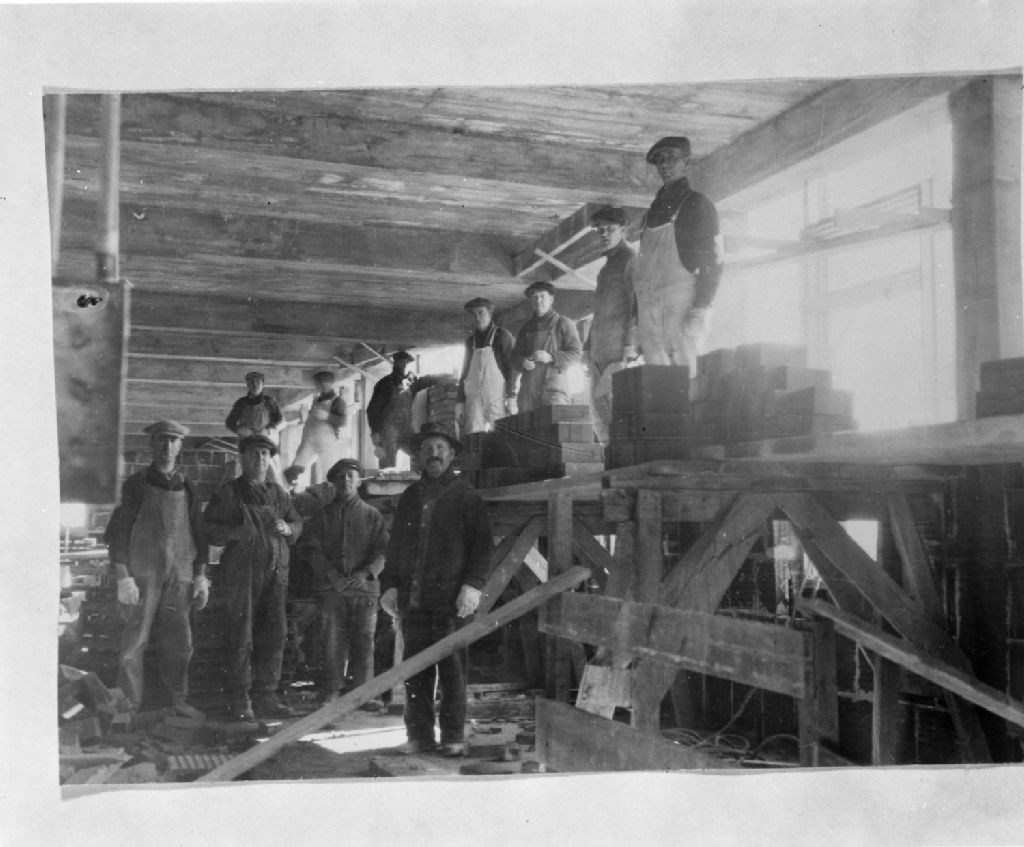 Travailleurs de la firme de construction E. Caron & Fils à Hull, Reproduit vers 1985 (original créé vers 1925], Archives nationales à Gatineau, Collection Centre de l'Outaouais de Bibliothèque et Archives nationales du Québec, (07H,P1000,S8,D20,P2), Photographe non identifié.